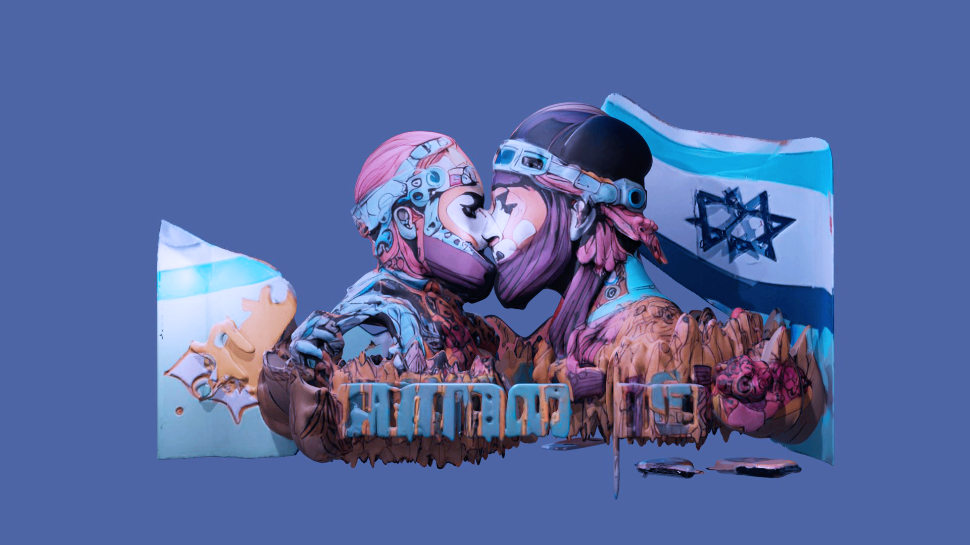 Future Determinants is an immersive installation that envisions speculative utopias for Israel and Palestine, realities shaped by unity, peace, and the imaginative lens of Gellis’s childhood. Drawing from the vibrant language of street art, we’re exploring how art in public spaces addresses cultural conflict while proposing utopic narratives. Using virtual reality, prismatic animation, and layered textures of trash and rubble, I reframe discarded materials into visions of possibility. AI-mediated “synthwave” landscapes, Street Art scenes in VR, and subversive Bazooka Gum comic wrappers, this interactive work invites viewers to engage with alternate futures. Conceptual mirroring is a guiding visual theme that reflects both present realities and fantastical aspirations. This work is created from personal experiences living in Israel during the Hamas-Israel conflict, and melds nostalgia, playfulness, and radical hope into a reimagined Israel where art disrupts, rebuilds, and envisions anew.