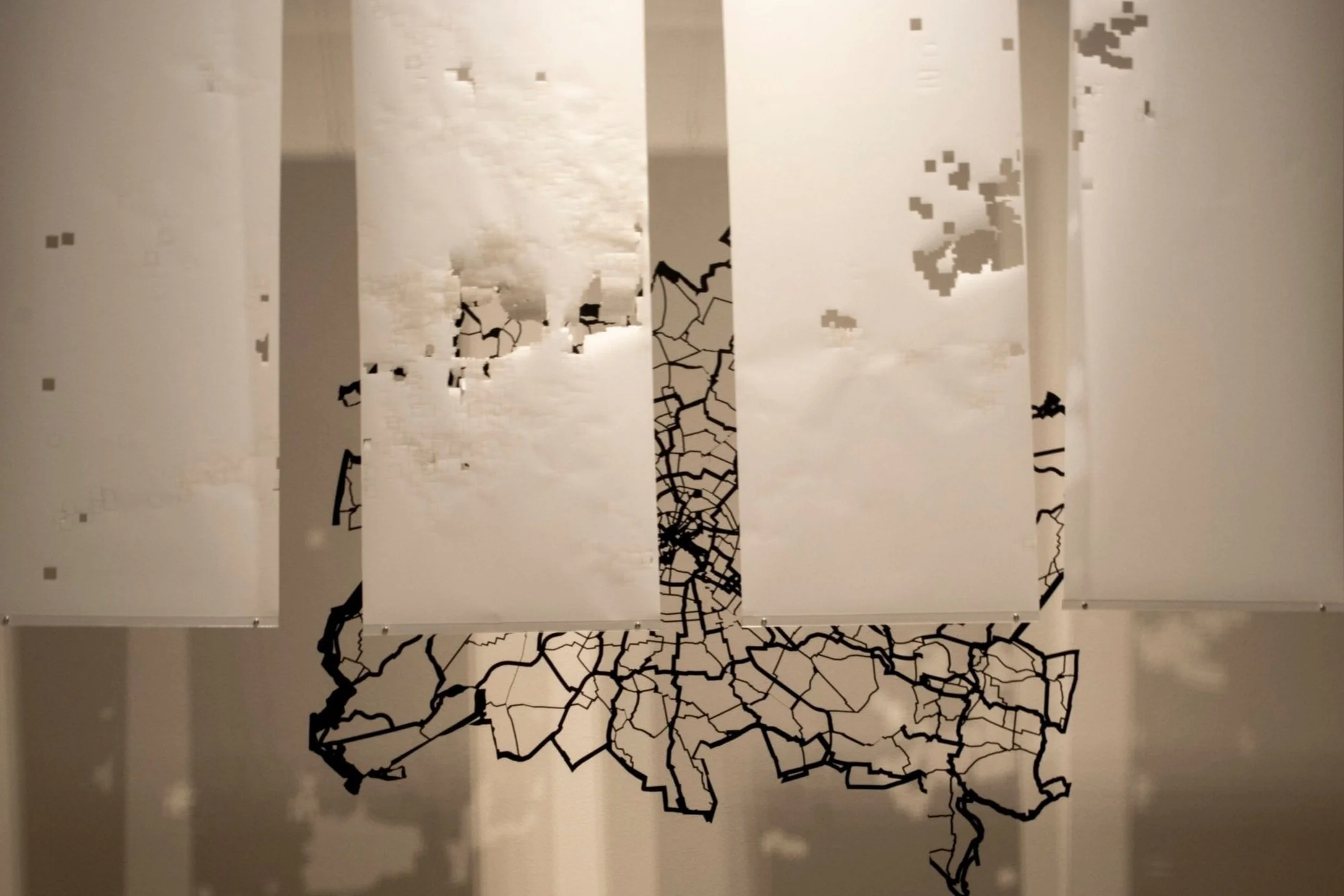 Laser-cut vellum, cut vinyl, data visualization, 2019.